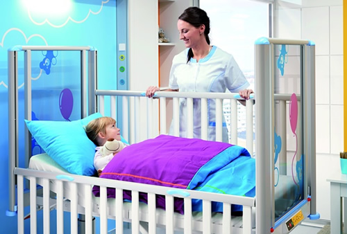 В самом нижнем положении сложенное боковое ограждение находится под уровнем ложа, что значительно облегчает ежедневный уход. Серединное положение бокового ограждения обеспечивает хороший обзор со стороны пациента, что позволяет сделать общение с родными гораздо более комфортным для ребенка. Наивысшее положение бокового ограждения обеспечивает максимальный уровень безопасности.
